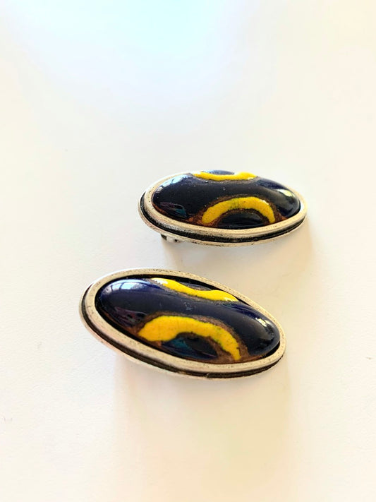 Clips ovales signés Lhassa argenté bleu et jaune La friperie vintage