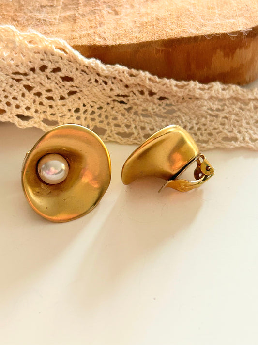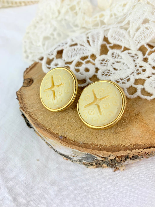 Clips d'oreilles vintage rond doré et écru