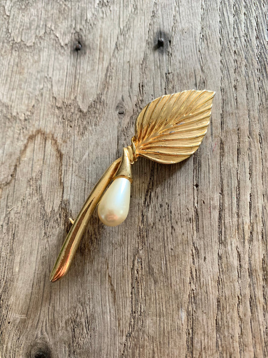Broche vintage feuille en métal doré et perle nacrée