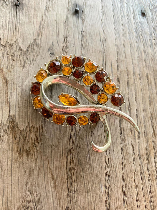 Broche vintage métal argenté orné strass marron orangé