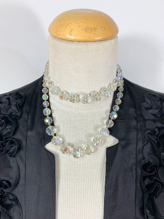 Collier vintage deux rangs perles en verre transparentes à reflets et facettes