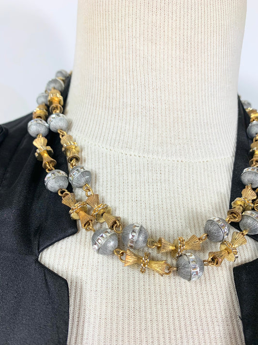 Collier vintage deux rangs perles métal doré et argenté