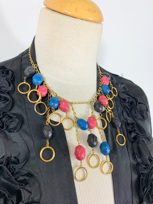 Collier vintage Wilma Spagli Italie perles bleu rose noir et chaine dorées