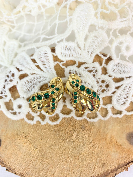 Boucles d'oreilles clips vintage ruban métal doré orné strass vert