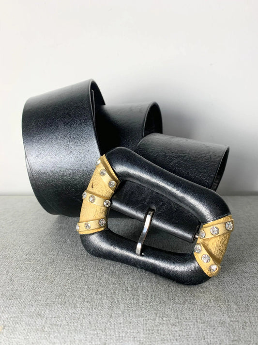 Ceinture vintage en cuir noir boucle dorée strass La friperie vintage