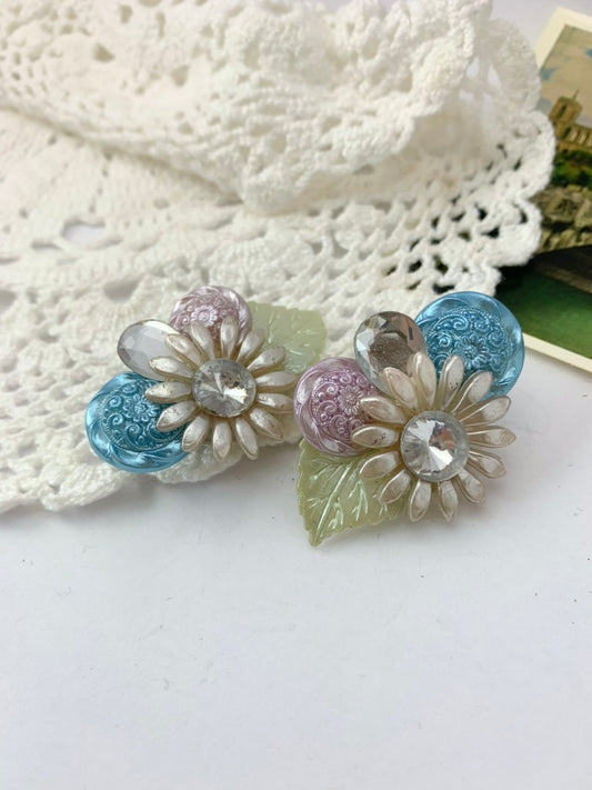 Boucles d'oreille clips vintage plastique pâquerette bleu et or