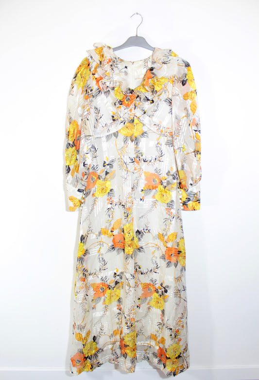 Robe longue vintage à volants blanche fleurs orange bohème années 70