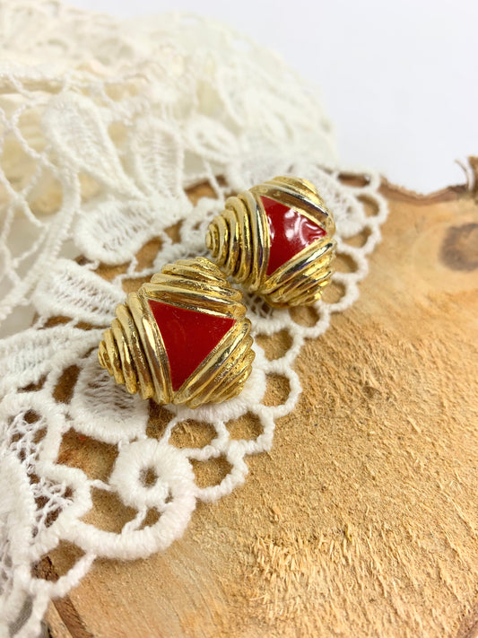 Boucles d'oreilles vintage clips triangle bombé or et rouge émaillé