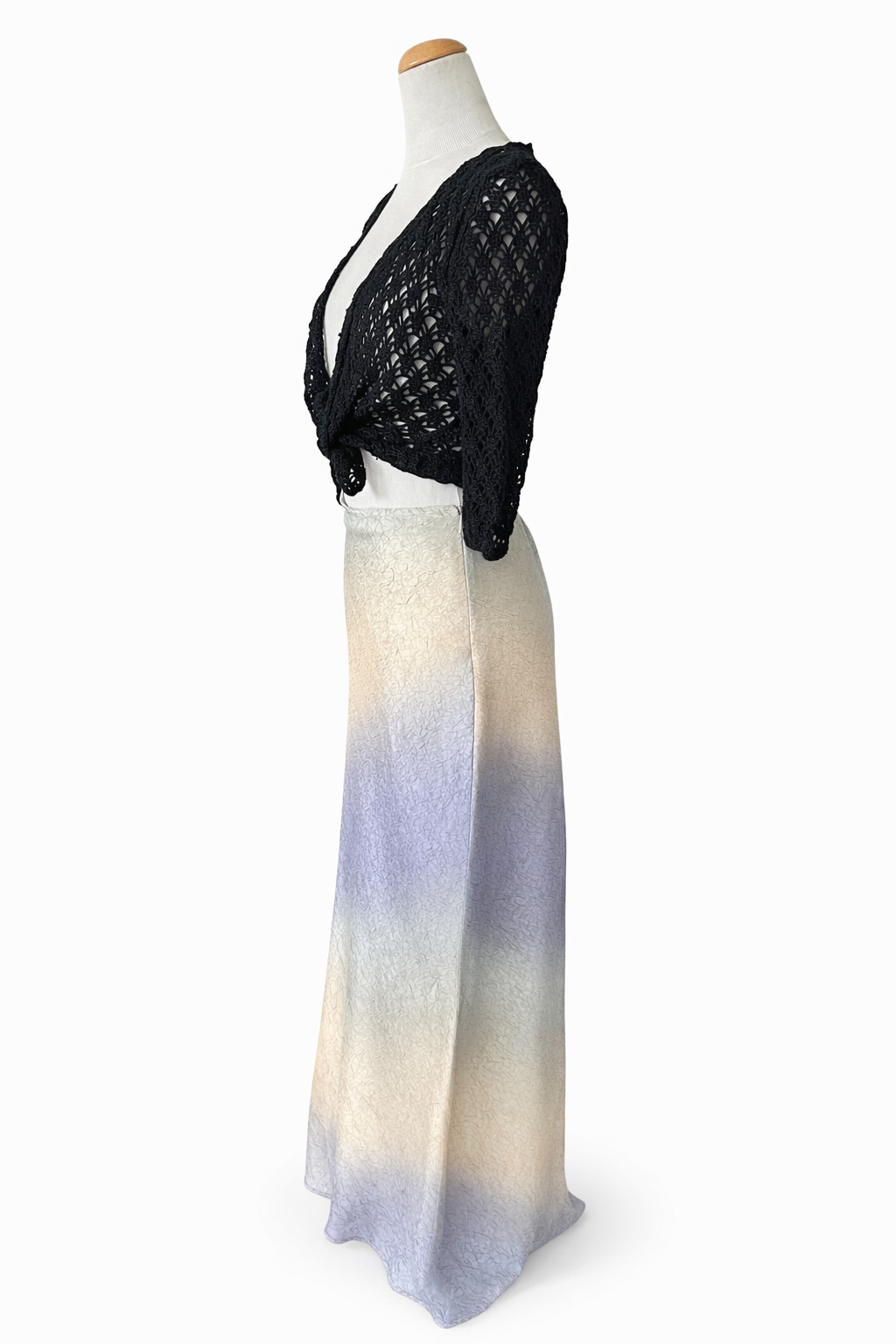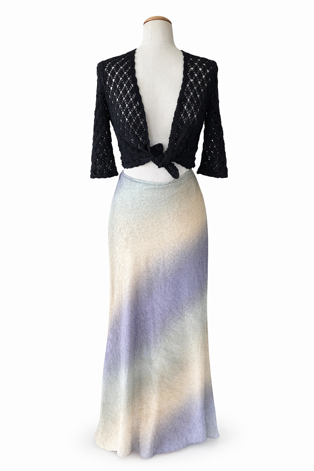 Jupe longue vintage dégradé beige/bleu/vert, matière texturée, très fluide et élégante ✨