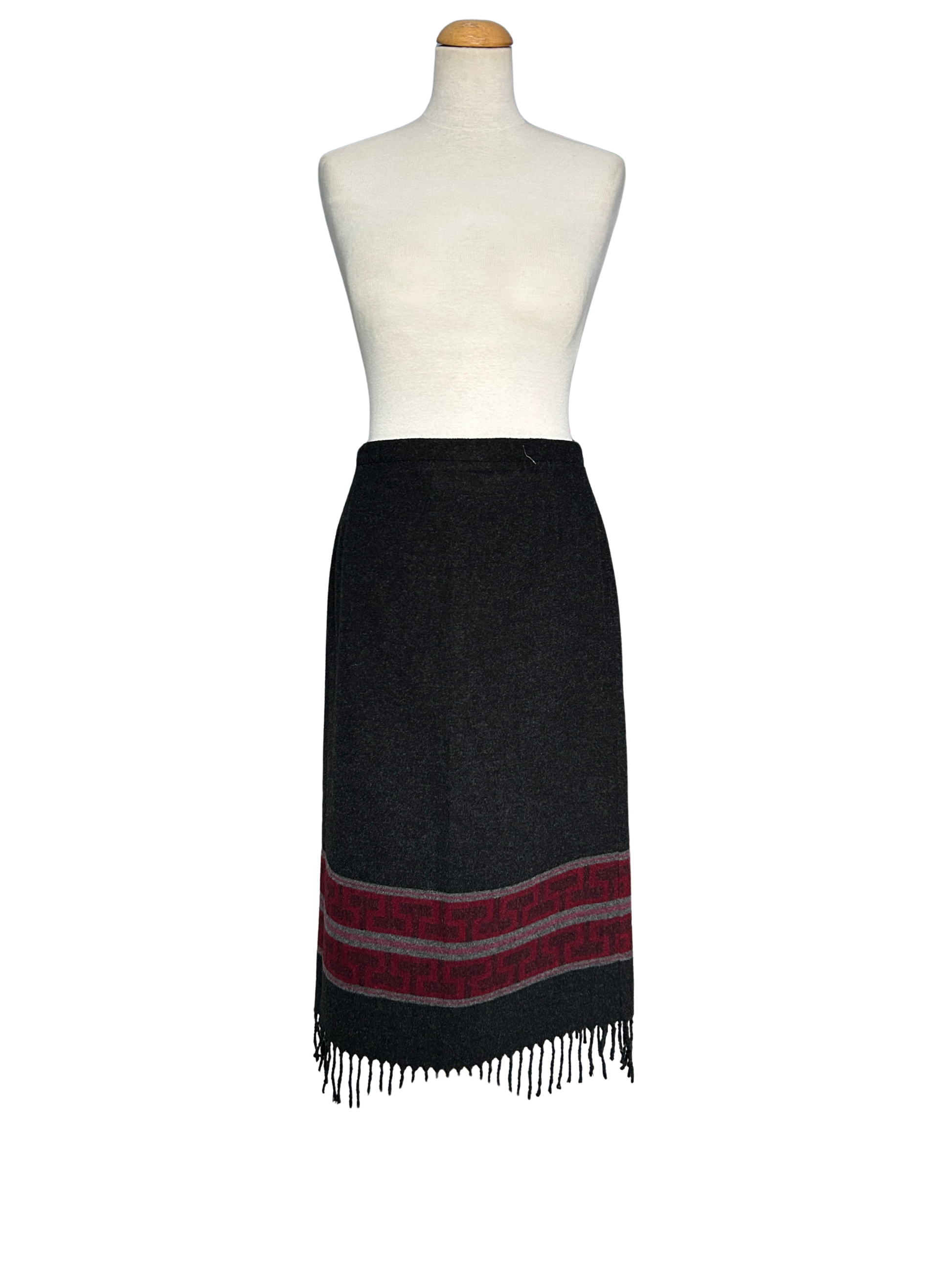Jupe longue vintage noire à franges – Motif géométrique bordeaux