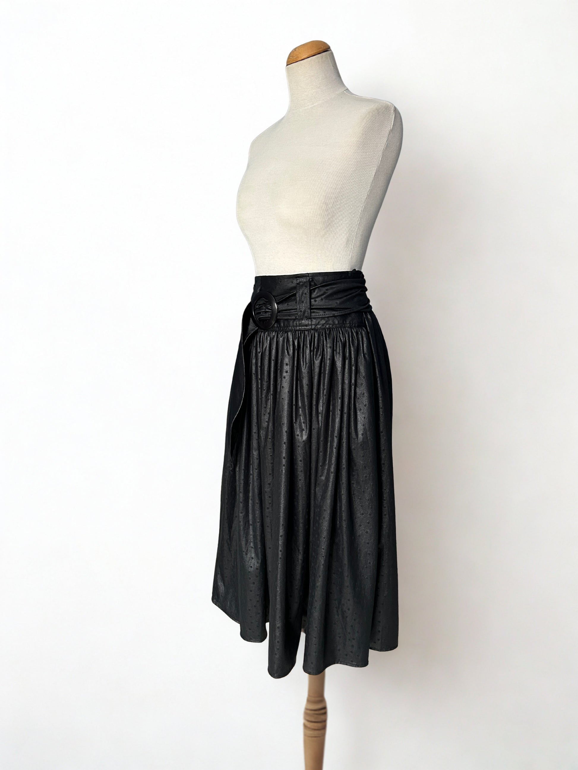 Jupe vintage noire en imitation cuir, à la coupe midi fluide et taille haute.