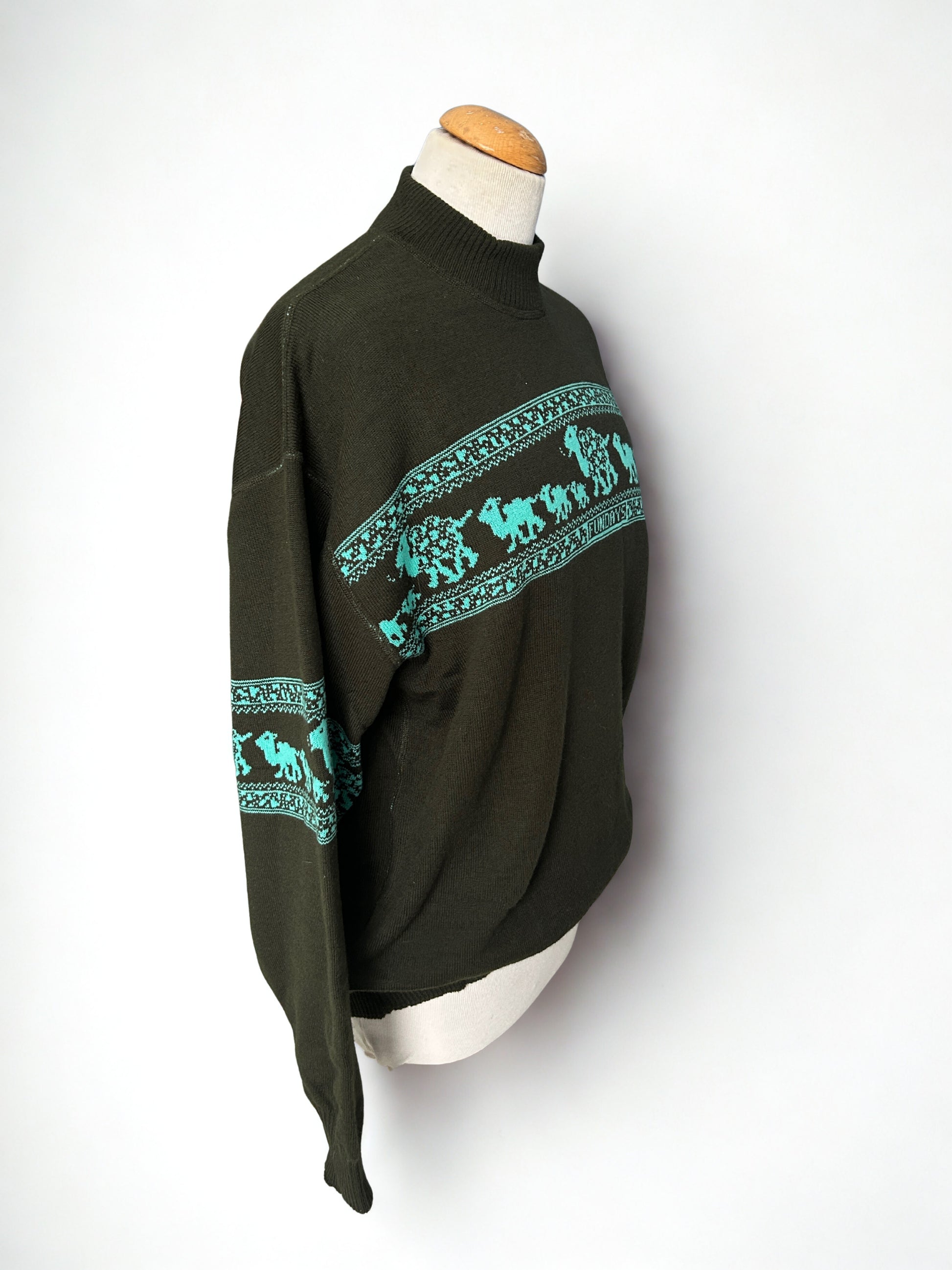 Pull vintage col montant motif frise turquoise – Fabriqué en France – L/XL