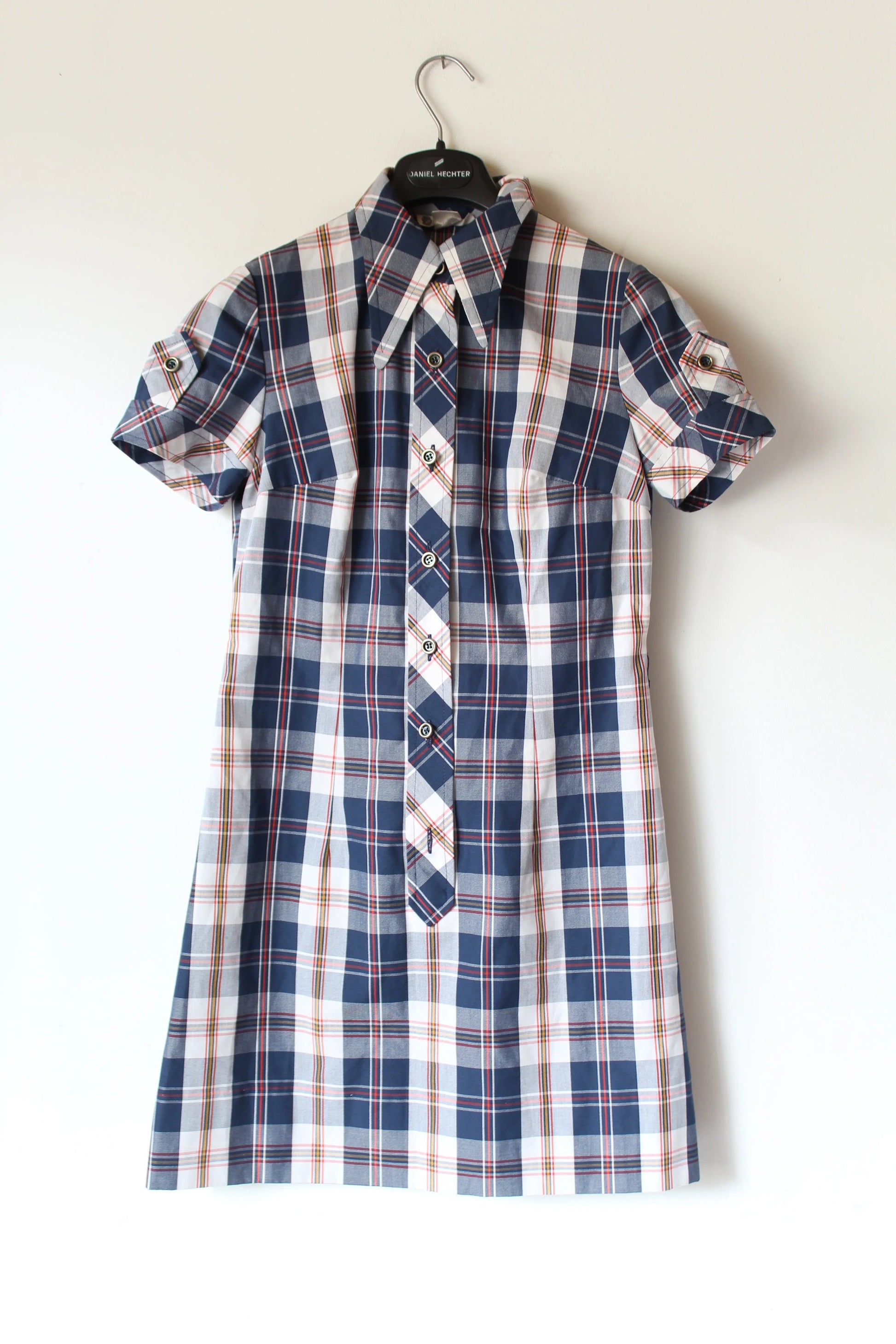 Robe chemise vintage à carreaux bleu marine blanc manches courtes